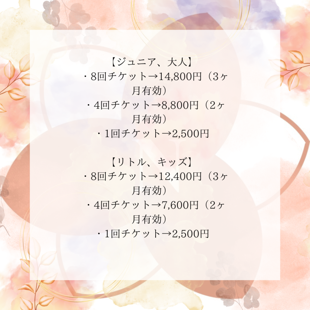 料金システム変更のお知らせ 2024年11月26日 Last updated : 2024年12月1日 LilyN DanceStudio LilyN DanceStudioでは2025年1月よりチケット制での運用に変更させて頂きます。皆さまにはお手数をおかけいたしますが、ご理解いただけますと幸いです。今後ともよろしくお願い致します。